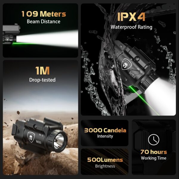 WARRIORLAND MB3 Pistol Light and Custom Kydex Holster, Fit for Sig Sauer P320 Compact M18, Compact 500 Lumens Universal Rail Mounted Tactical Weapon Light with Green Laser & White LED, Power Indicator