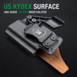 - KYDEX HOLSTER LEATHER INTERIOR: In order to avoid possible scratches of kydex holster and dropping risks of leather holster. We finally produced this kydex holster with leather interior, it possess kydex’s durable and molded fit. Suede leather interior can avoid possible scratches when holstering and drawing