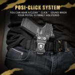 - POSITIVE AUDIBLE “CLICK” LOCK SYSTEM: When holster retention is well customized, you would hear clear “click” sounds when your handgun is firmly holstered