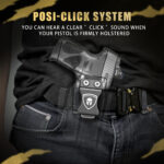 - POSITIVE AUDIBLE “CLICK” LOCK SYSTEM: When holster retention is well customized, you would hear clear “click” sounds when your handgun is firmly holstered