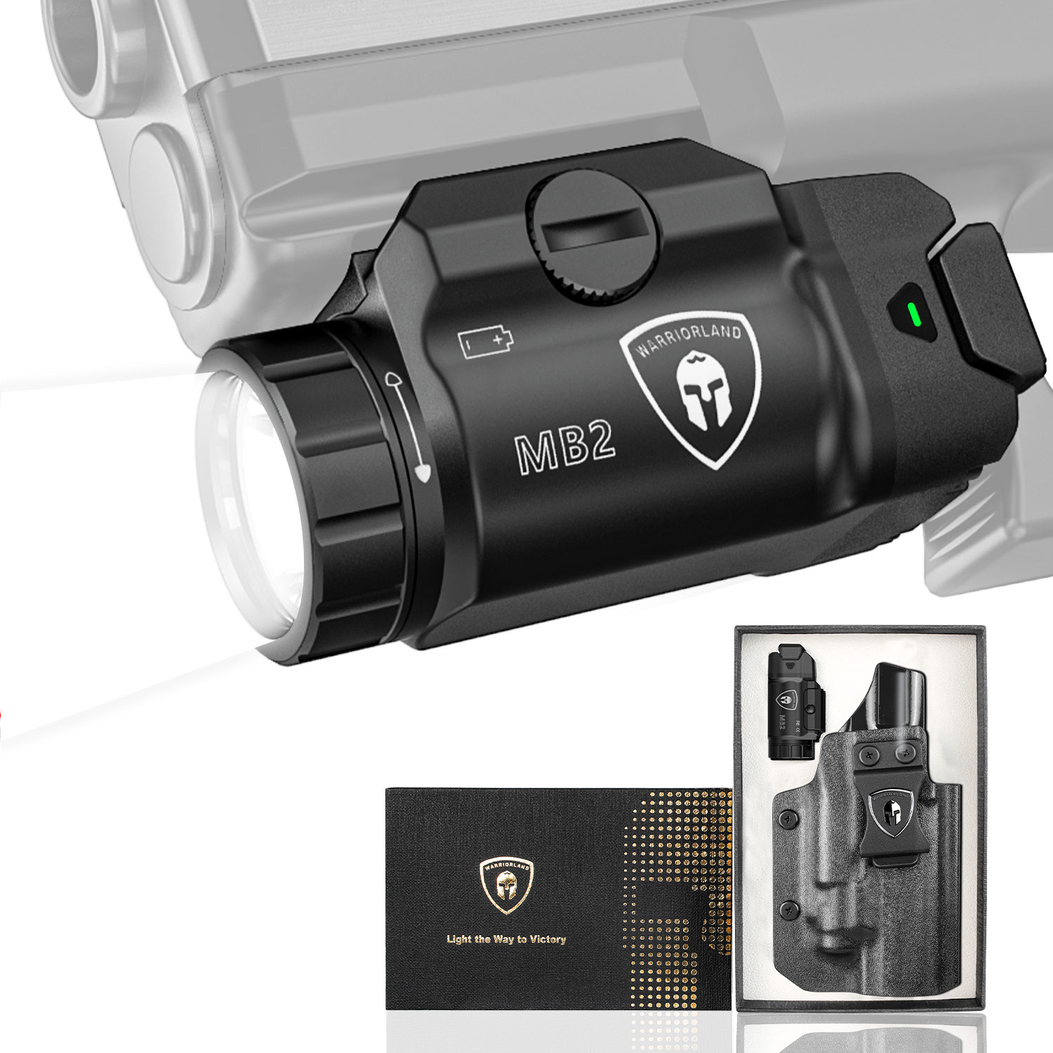 - Compact & Lightweight Design: The MB2 pistol light is designed for portability and ease of use. It features ambidextrous switches and a forward activation button for quick access when drawing your handgun. The built-in power indicator lets you monitor battery status in real-time.