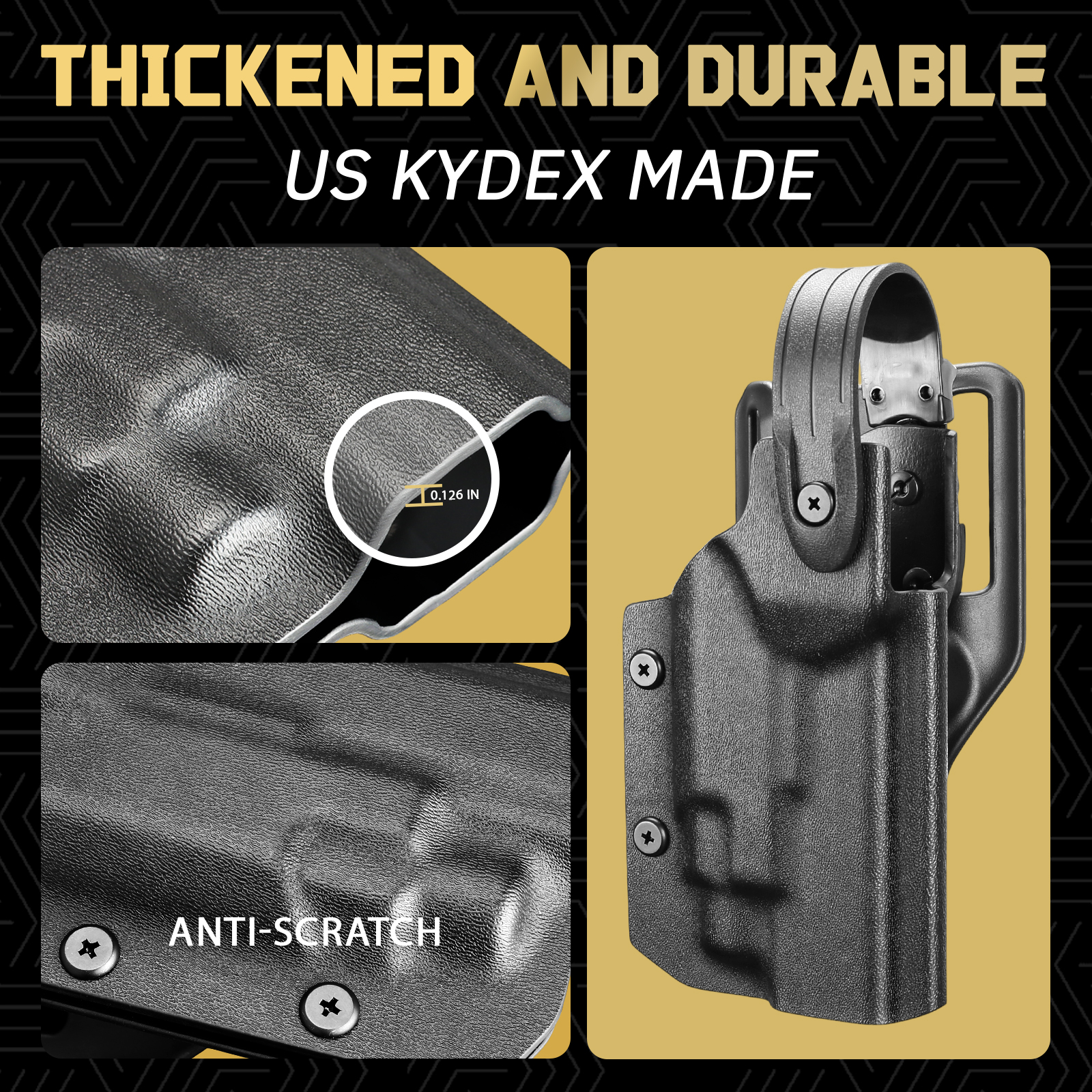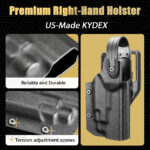 Constructed from premium 0.126″ US-made Kydex for superior strength, heat resistance, and long-lasting performance in duty, range, or tactical environments.Optics & Threaded Barrel Ready