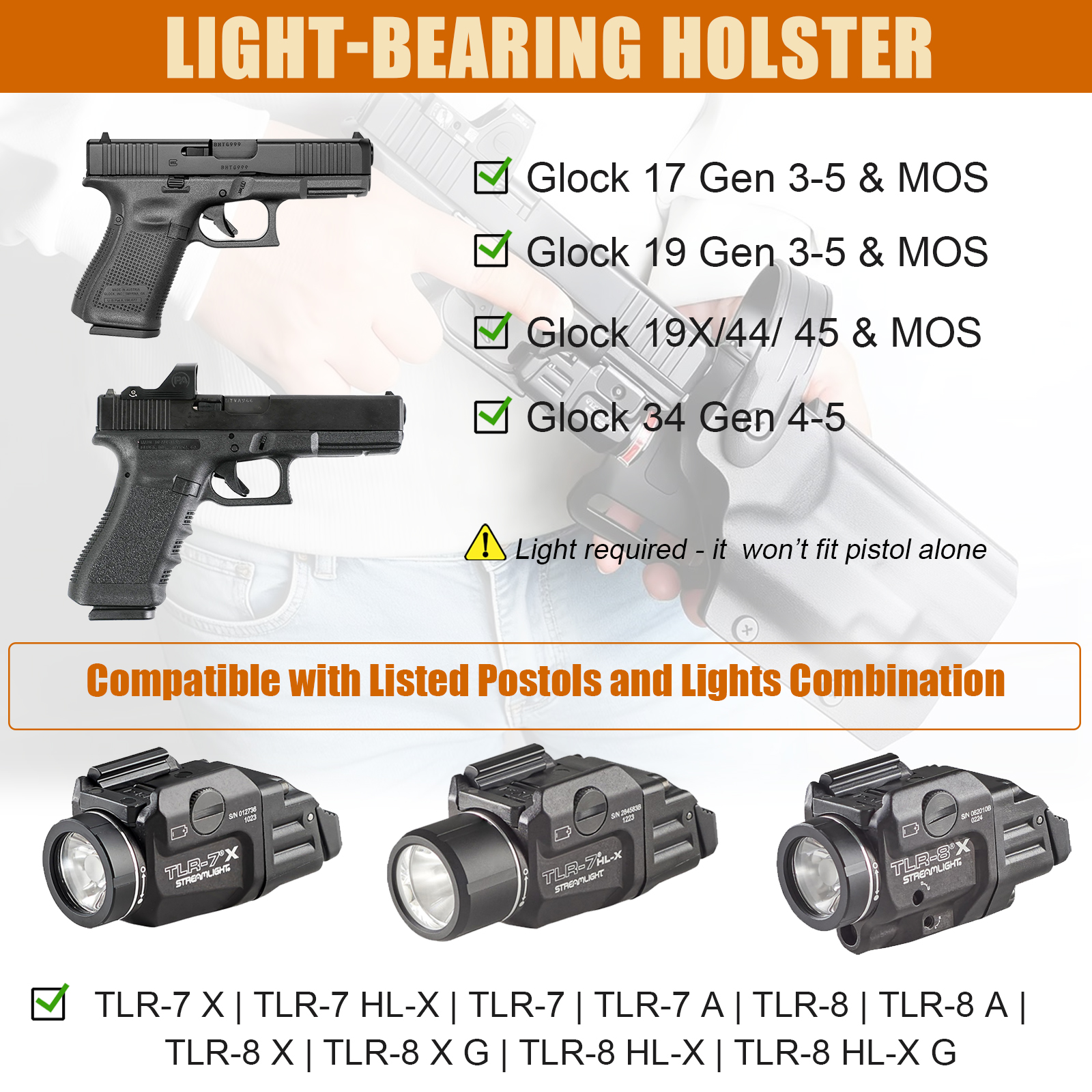 Right-hand Kydex holster precisely molded for Glock 17/19 Gen 3–5, 19X, 44, 45, and Glock 34 Gen 4–5 (including MOS models) with mounted Streamlight TLR-7 or TLR-8 series lights. Designed for light-mounted pistols only.Level II Thumb-Release Retention