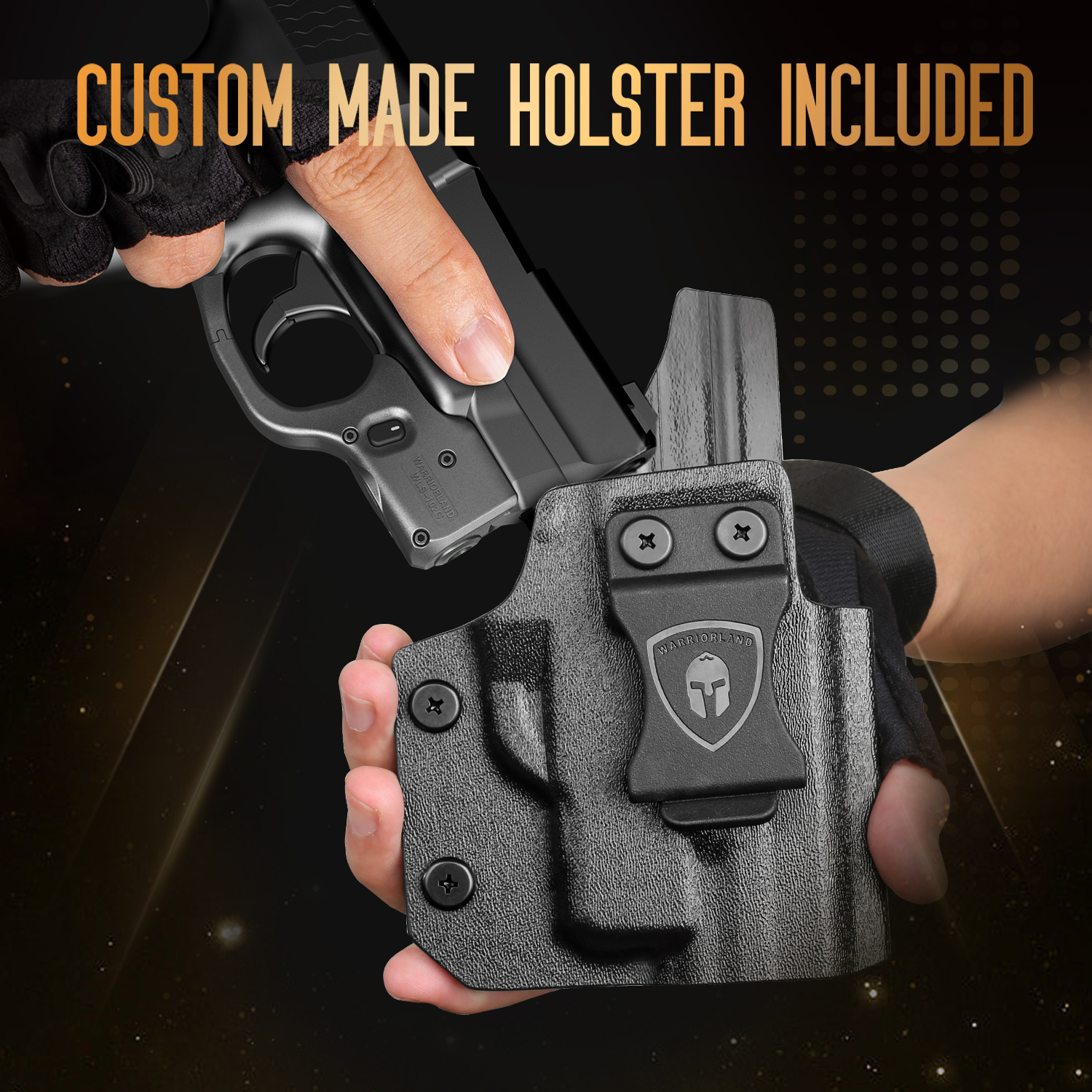 Right Hand Kydex Holster Included — Package comes with 1x Green Laser Sight, 1x Custom-made IWB Right Hand Kydex Holster, 2x CR-1/3N batteries, 1x Wrench for Laser Adjustment, 2x Cotton swabs for cleaning, 1x User Manual and 1x Waterproof ring, 1x Laser Label.