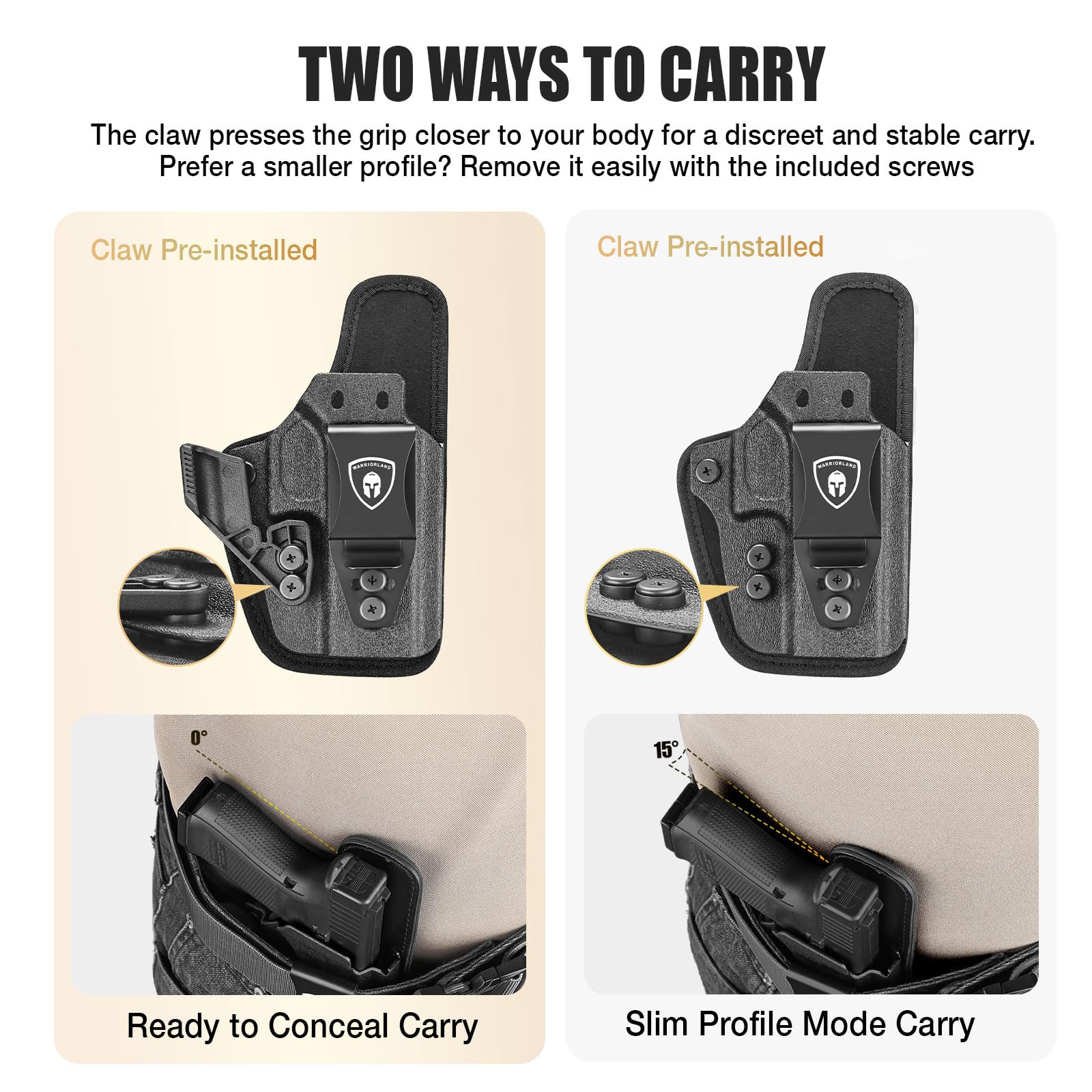 - Multiple Carry Options for Flexibility — Use the pre-installed concealment claw or remove for a slimmer profile; adjustable clip height and alternate mounting holes (clips not included)