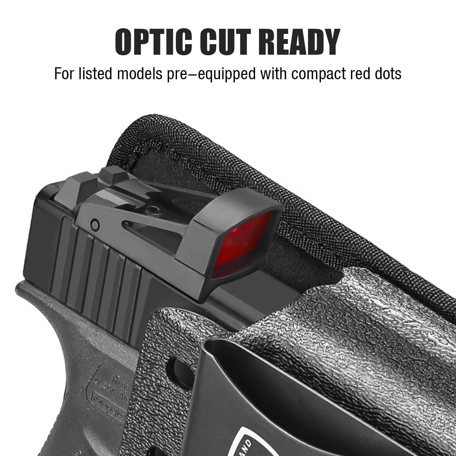 Optic Ready & Compensator Friendly → Built to accept micro/red-dot optics; the open-bottom design also accommodates pistols with compensators or threaded barrels.