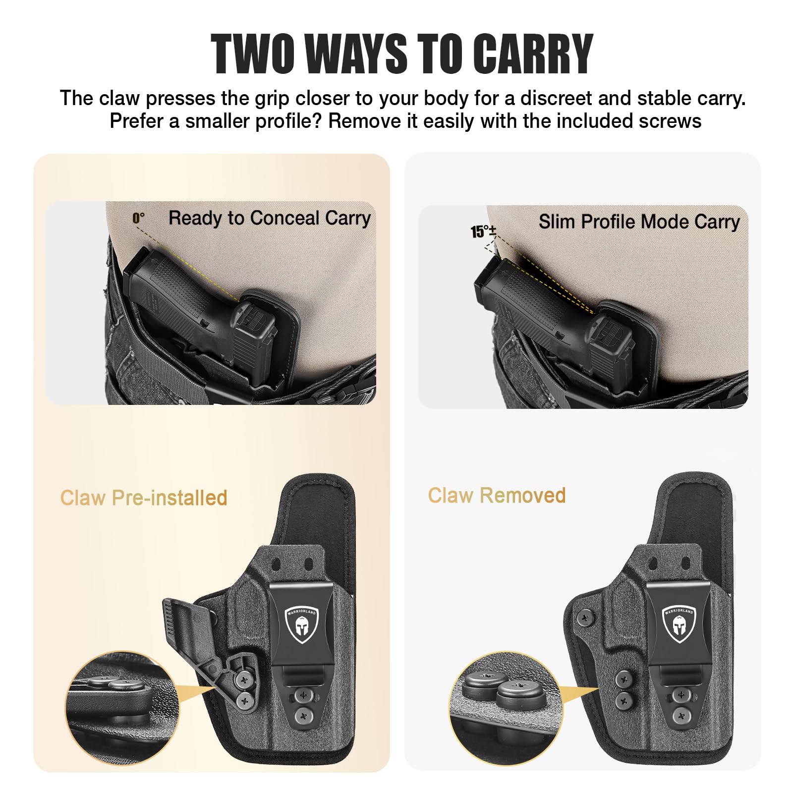 Multiple Carry Options for Versatility → Use the included claw for improved concealment or remove it for a slimmer silhouette; clip height is adjustable and alternate mounting holes accept different clips (clips sold separately).