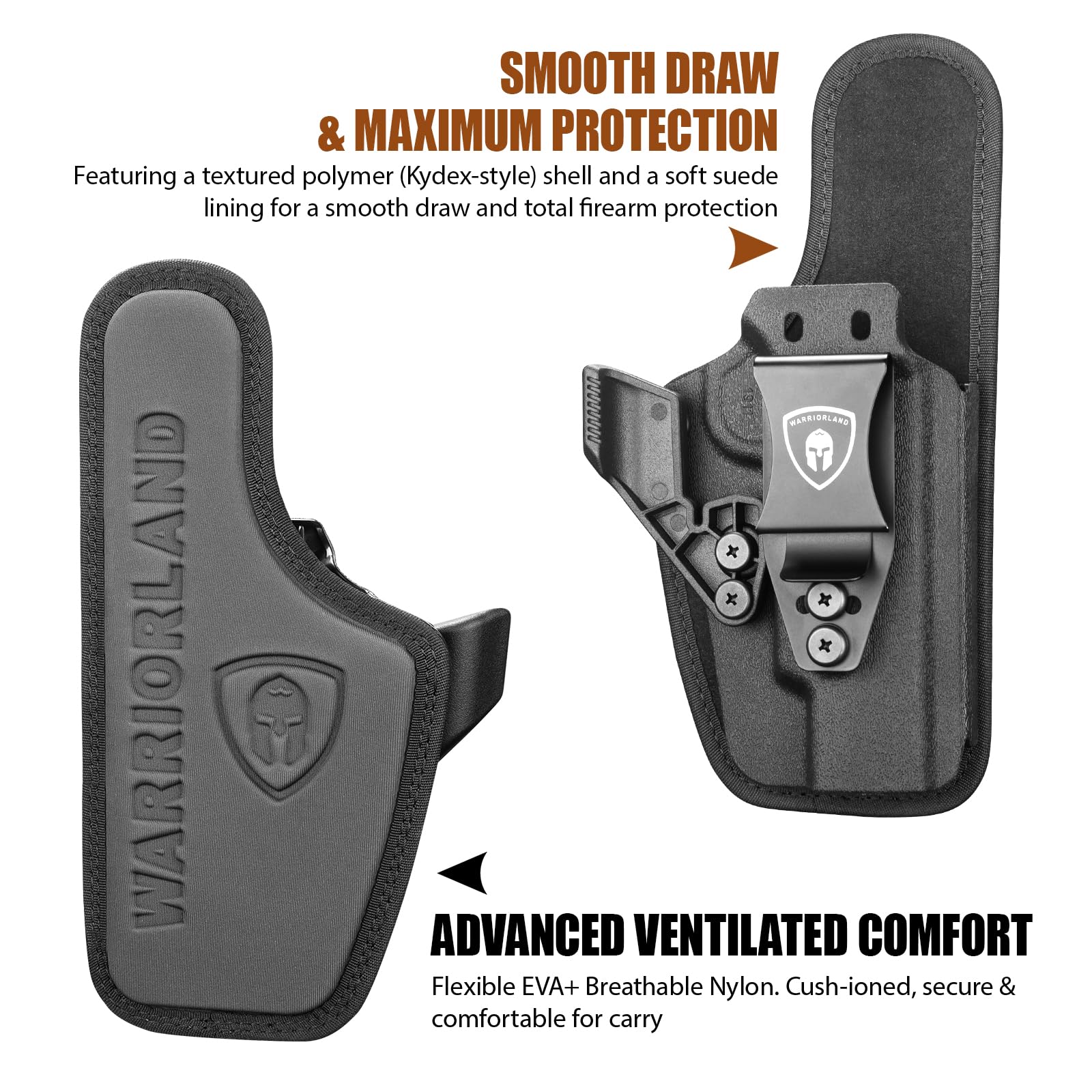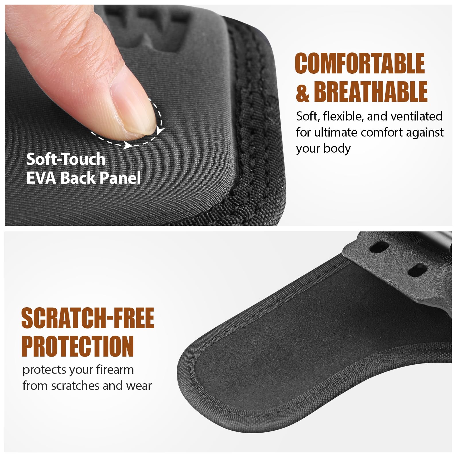- 𝗕𝗹𝗲𝗻𝗱𝗲𝗱 𝗖𝗼𝗺𝗳𝗼𝗿𝘁 & 𝗙𝗶𝗻𝗶𝘀𝗵 𝗣𝗿𝗼𝘁𝗲𝗰𝘁𝗶𝗼𝗻 – Built with a tough polymer (Kydex-style) outer shell paired with breathable multi-layer nylon, cushioned EVA, and soft microfiber suede backing to provide long-lasting comfort and safeguard your handgun’s finish.
