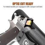 - 𝗥𝗲𝗱-𝗗𝗼𝘁 𝗙𝗿𝗶𝗲𝗻𝗱𝗹𝘆 & 𝗠𝘂𝘇𝘇𝗹𝗲-𝗥𝗲𝗮𝗱𝘆 – The optic-cut profile supports compact and micro red dot sights. An open-end muzzle design also allows compatibility with 1911s equipped with compensators or threaded barrels.