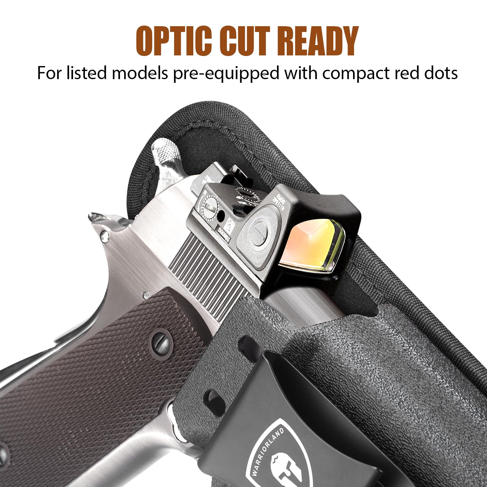 - 𝗣𝗿𝗲𝗰𝗶𝘀𝗲 𝗠𝗮𝘁𝗰𝗵 𝗳𝗼𝗿 𝟱” 𝟭𝟵𝟭𝟭𝘀 – This inside-the-waistband right-hand holster is molded to fit full-size 5″ 1911 pistols, including Colt 1911, Elite Force 1911, Kimber 1911, Rock Island Armory 1911, Springfield 1911, Tisas 1911, SDS 1911, Ruger SR1911, RIA 1911 A2 FS, Shadow Ghost (Carry), ATI GSG 1911, SIG Nightmare 1911 .45, and other similar 1911 platforms.