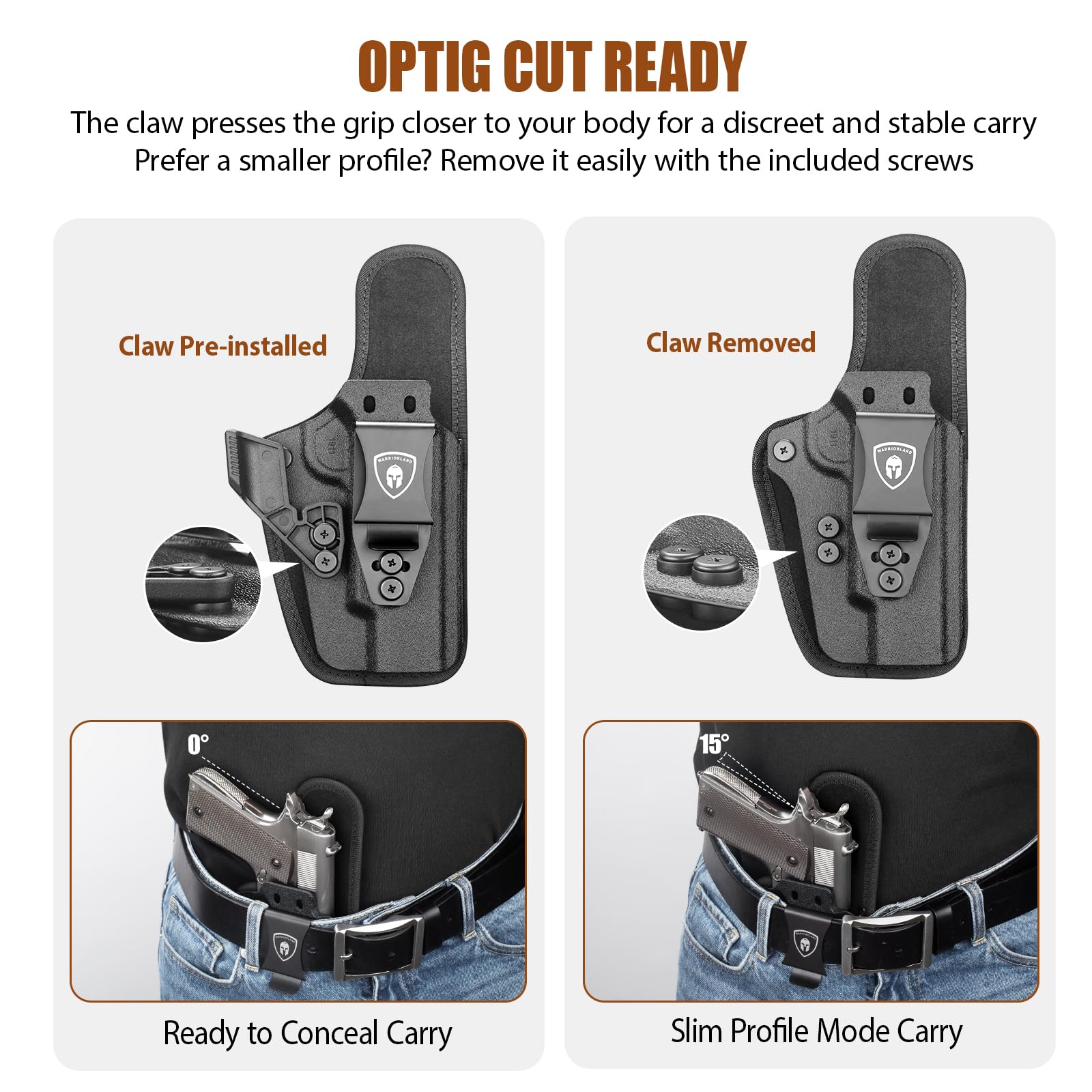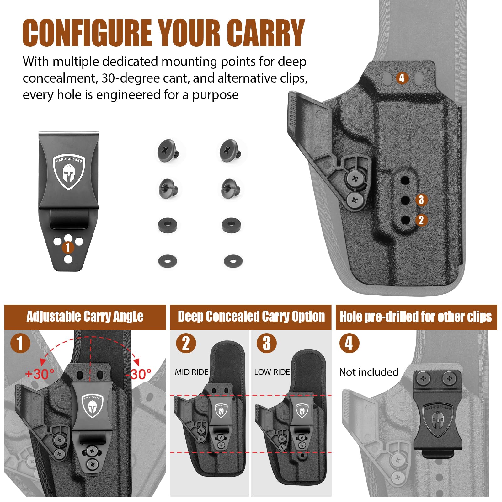 - 𝗖𝘂𝘀𝘁𝗼𝗺𝗶𝘇𝗮𝗯𝗹𝗲 𝗖𝗮𝗿𝗿𝘆 𝗢𝗽𝘁𝗶𝗼𝗻𝘀 – Use the installed concealment claw for reduced printing, remove it for a slimmer setup, adjust the ride height to your preference, or shift to alternate mounting holes when using different belt clips (not included).