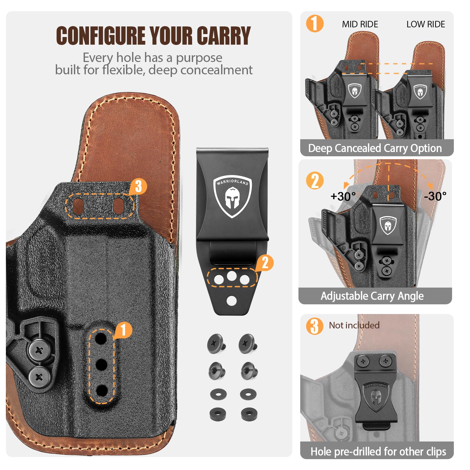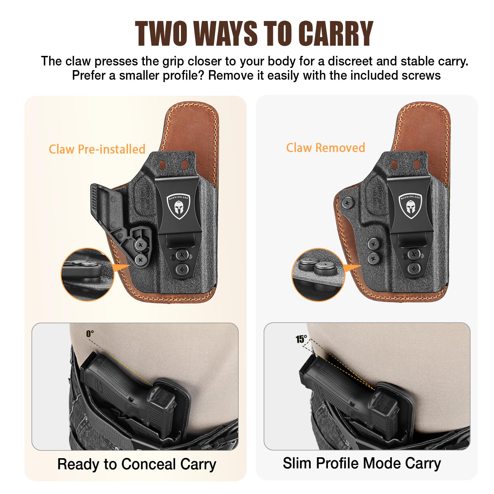 Multiple Carry Options – Pre-installed claw for enhanced concealment, removable for a slim profile. Adjustable clip height and alternate clip positions (clips not included) for personalized carry.