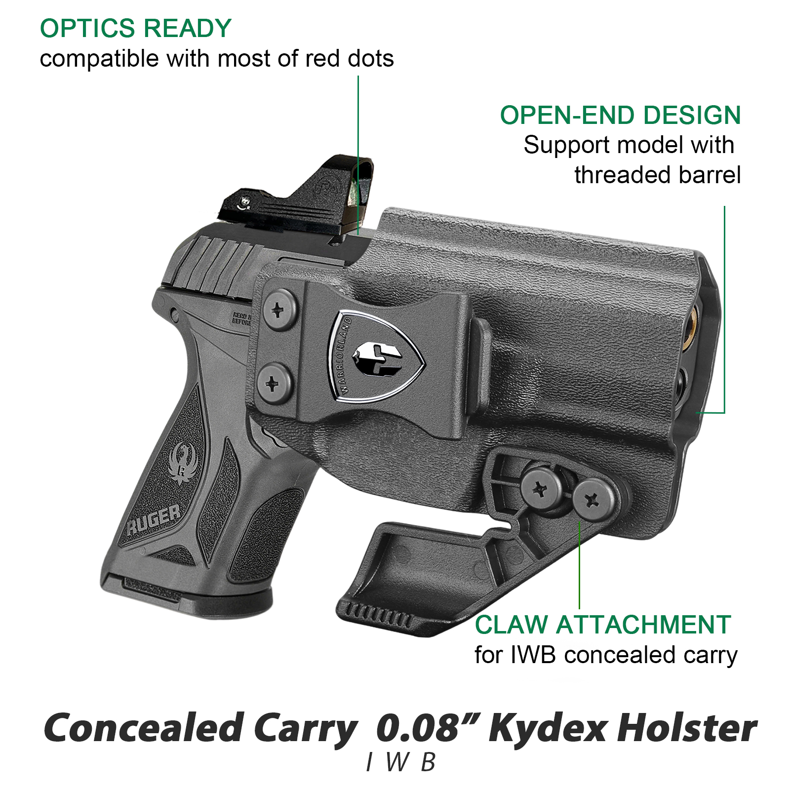 Premium U.S. Kydex Construction – Crafted from robust 0.08″ American-made Kydex, offering rigidity, low weight, and long-term durability. Open-ended muzzle design supports threaded barrels and compensators.