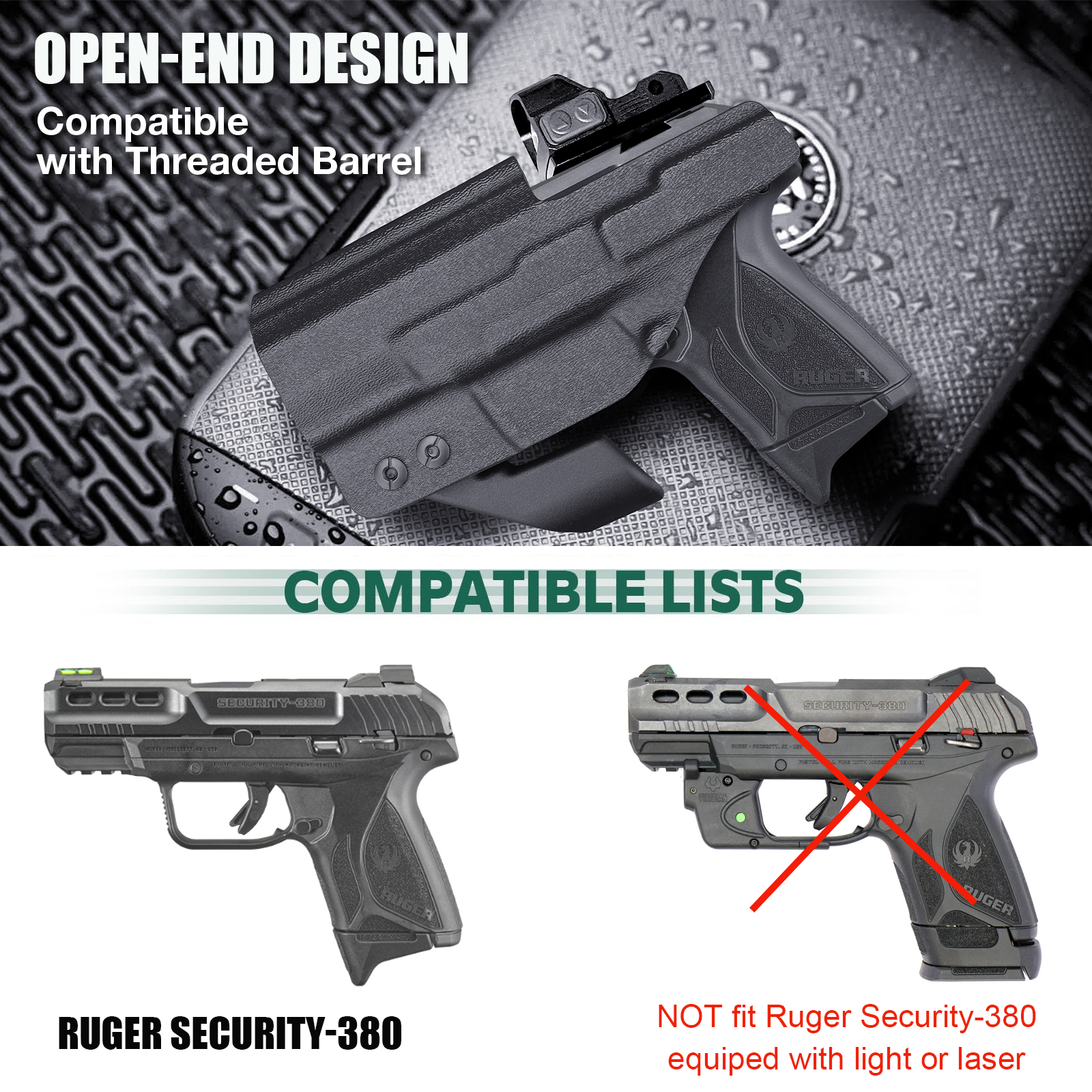 Wide Compatibility – Precision‑molded IWB holster engineered specifically for the Ruger Security‑380. Designed for right‑hand inside‑waistband carry. Not compatible with pistols equipped with weapon lights or lasers.