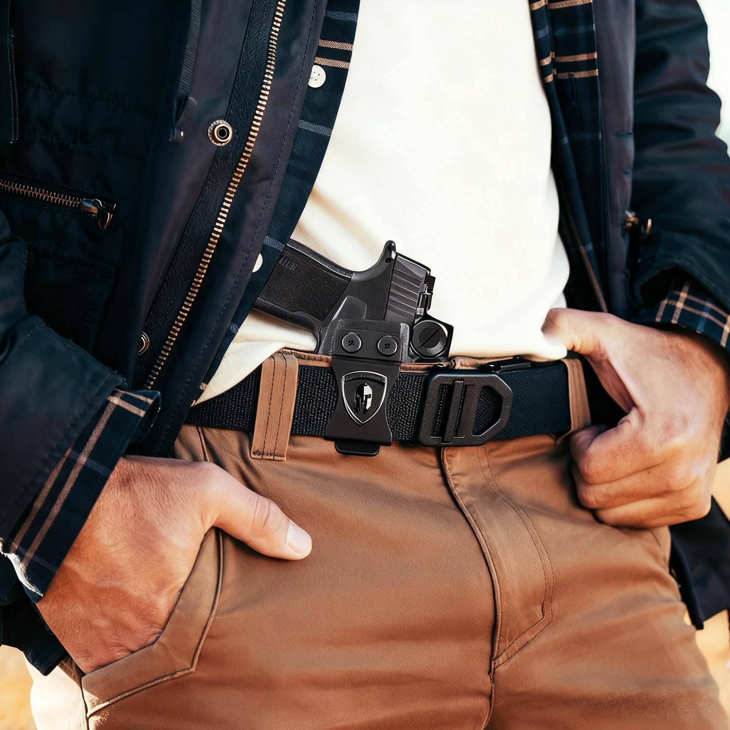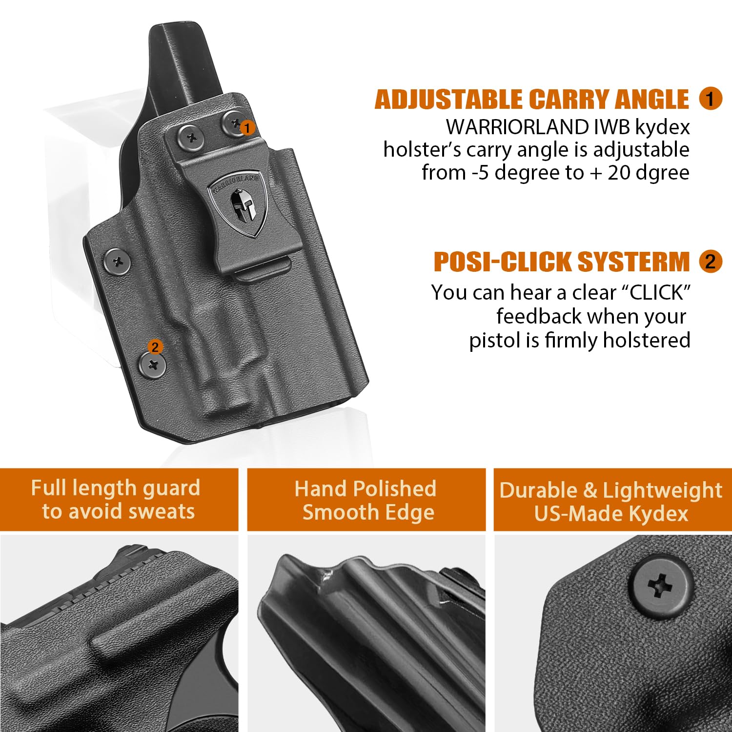 • 𝗣𝗼𝘀𝗶-𝗖𝗹𝗶𝗰𝗸 𝗥𝗲𝘁𝗲𝗻𝘁𝗶𝗼𝗻 & 𝗙𝘂𝗹𝗹 𝗦𝘄𝗲𝗮𝘁 𝗚𝘂𝗮𝗿𝗱 – Get peace of mind with an audible “click” when your firearm is securely holstered (Adjust the retention screws for better fit), along with a full-length sweat guard to protect your gun from moisture