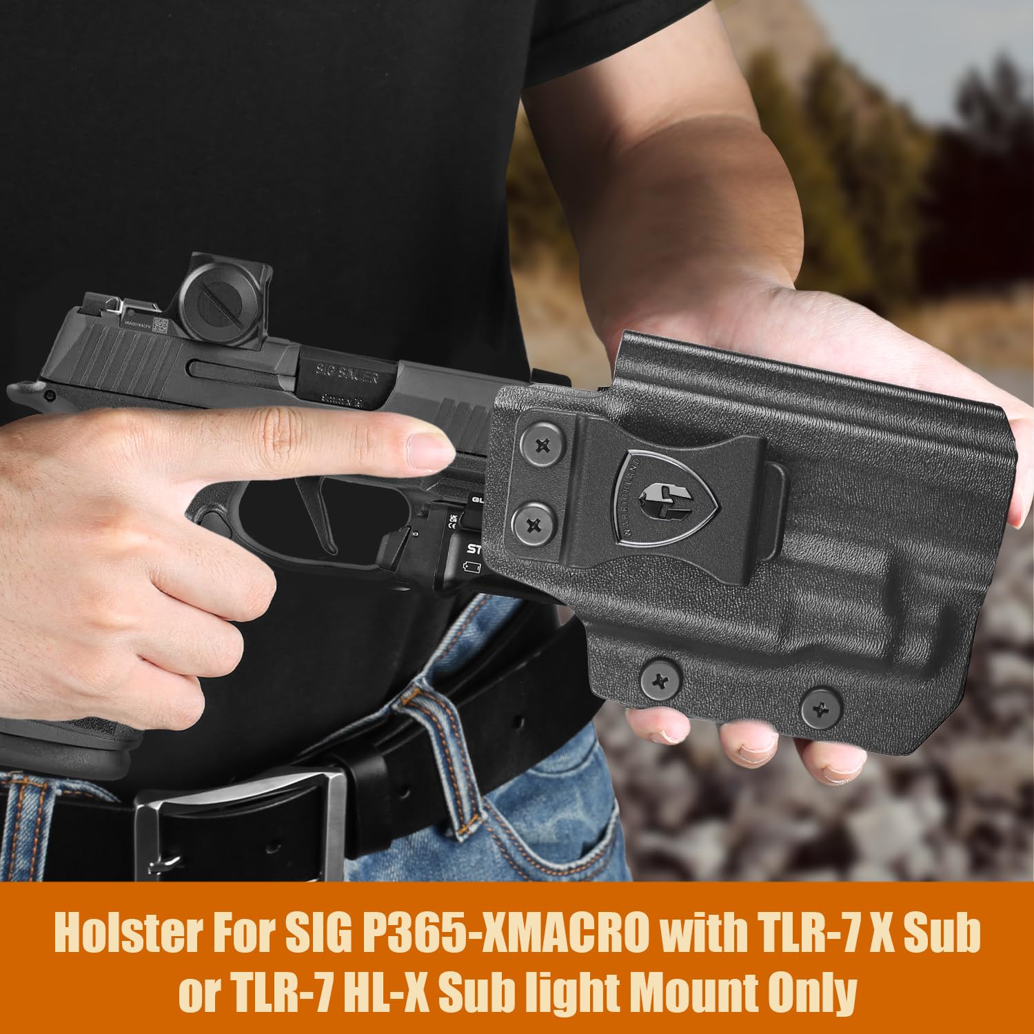 • 𝗖𝗼𝗺𝗽𝗮𝘁𝗶𝗯𝗹𝗲 𝗹𝗶𝘀𝘁 – Designed exclusively and solely for Sig P365-XMACRO with TLR-7 X Sub (69407) / TLR-7 HL-X Sub (69505) lights ONLY, ensuring a secure and snug fit. Right Hand only (Note: Not fit P365 / P365X /P365XL, or listed pistol without light, or other light / laser)
