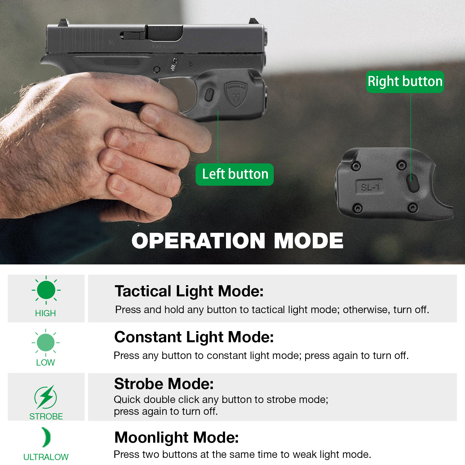 - IPX4 & 1M IMPACT- Protect the Glock 42 light from splashing water, no matter the direction – Passed 1 meters drop test