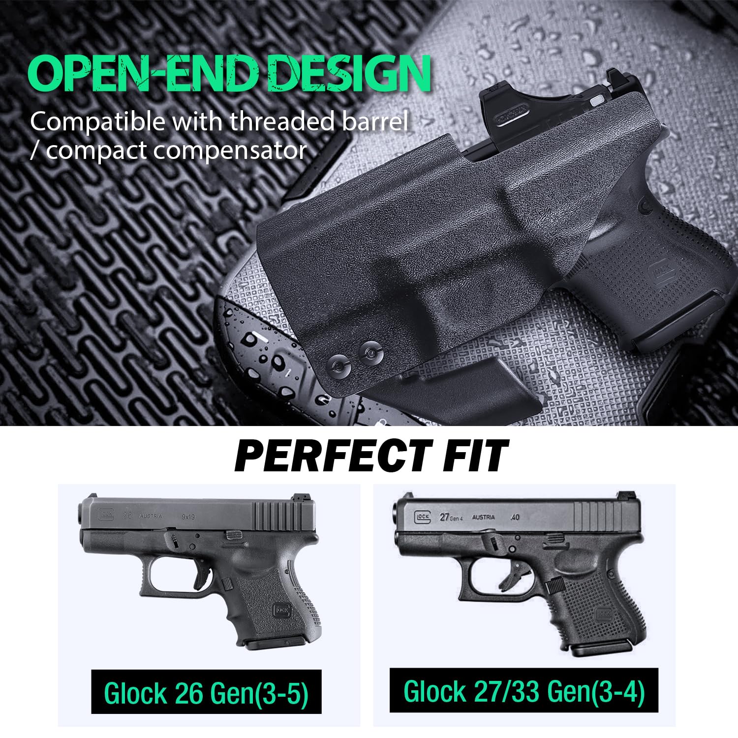 - 𝗖𝗼𝗺𝗽𝗮𝘁𝗶𝗯𝗹𝗲 𝗟𝗶𝘀𝘁 – Inside-the-waistband Kydex holster precisely molded for Glock 26 / 27 / 33 and MOS variants, delivering a snug fit, dependable retention, and superior concealment.