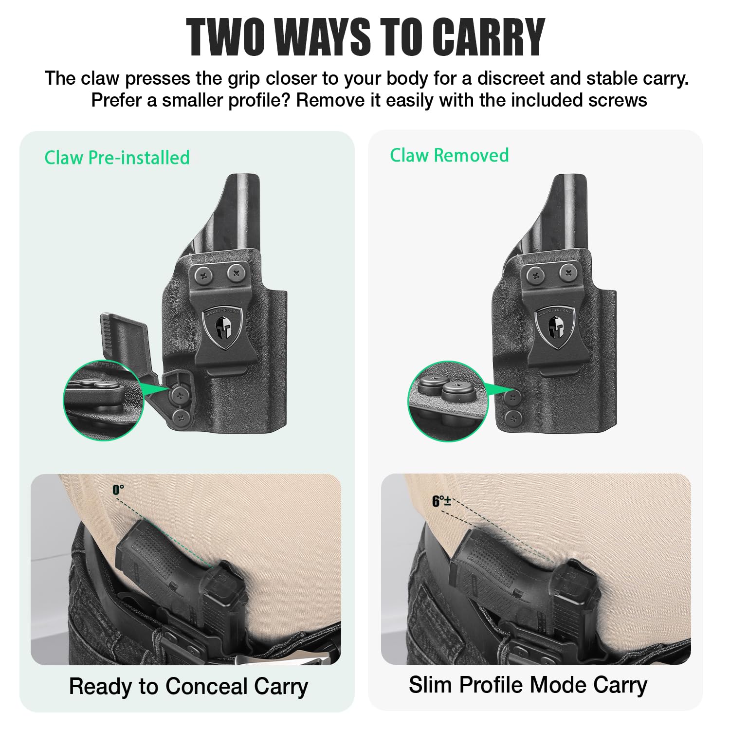 - 𝗢𝗽𝘁𝗶𝗰 𝗖𝘂𝘁 & 𝗖𝗼𝗻𝗰𝗲𝗮𝗹𝗺𝗲𝗻𝘁 𝗖𝗹𝗮𝘄 – Engineered for red-dot compatibility and equipped with a concealment claw to minimize printing; includes spare hardware to switch between clawed or standard carry setup.