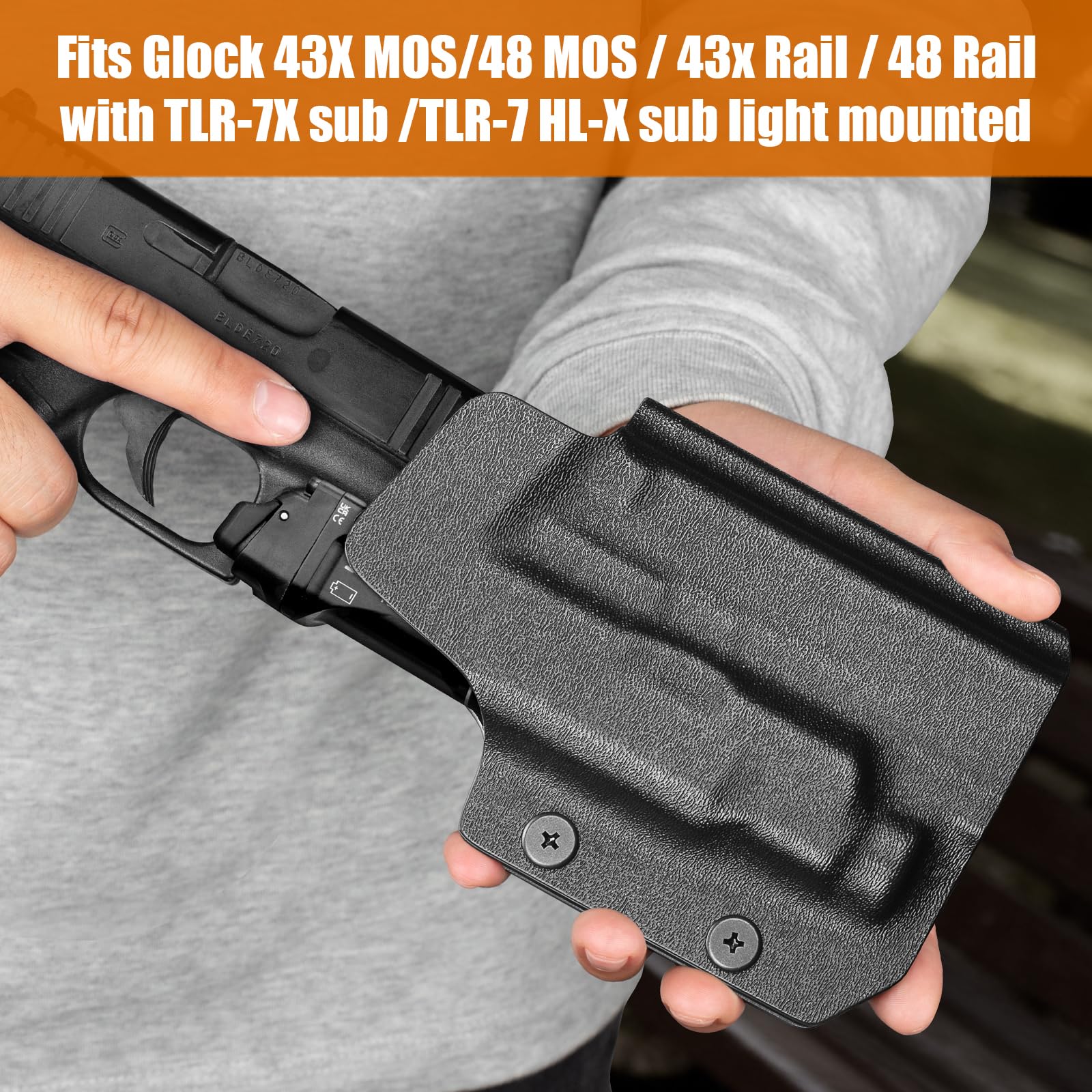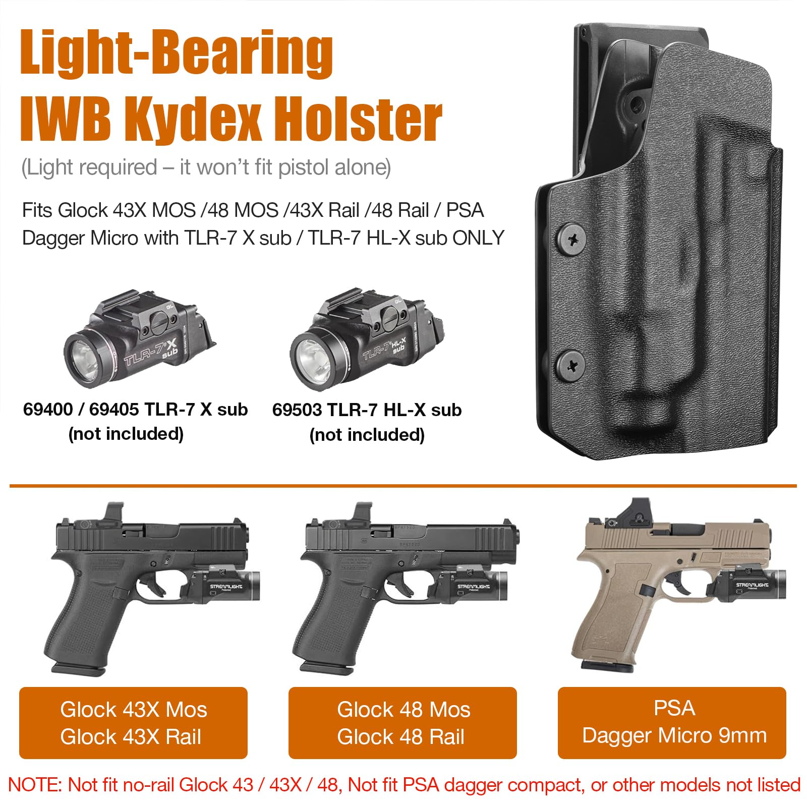 - 𝘊𝘰𝘮𝘱𝘢𝘵𝘪𝘣𝘭𝘦 𝘞𝘪𝘵𝘩 – Engineered specifically for Glock 43X MOS / 48 MOS / 43X Rail / 48 Rail / PSA Dagger Micro equipped with TLR-7 X Sub (69400 / 69405) or TLR-7 HL-X Sub (69503) lights, guaranteeing a precise and secure fit.