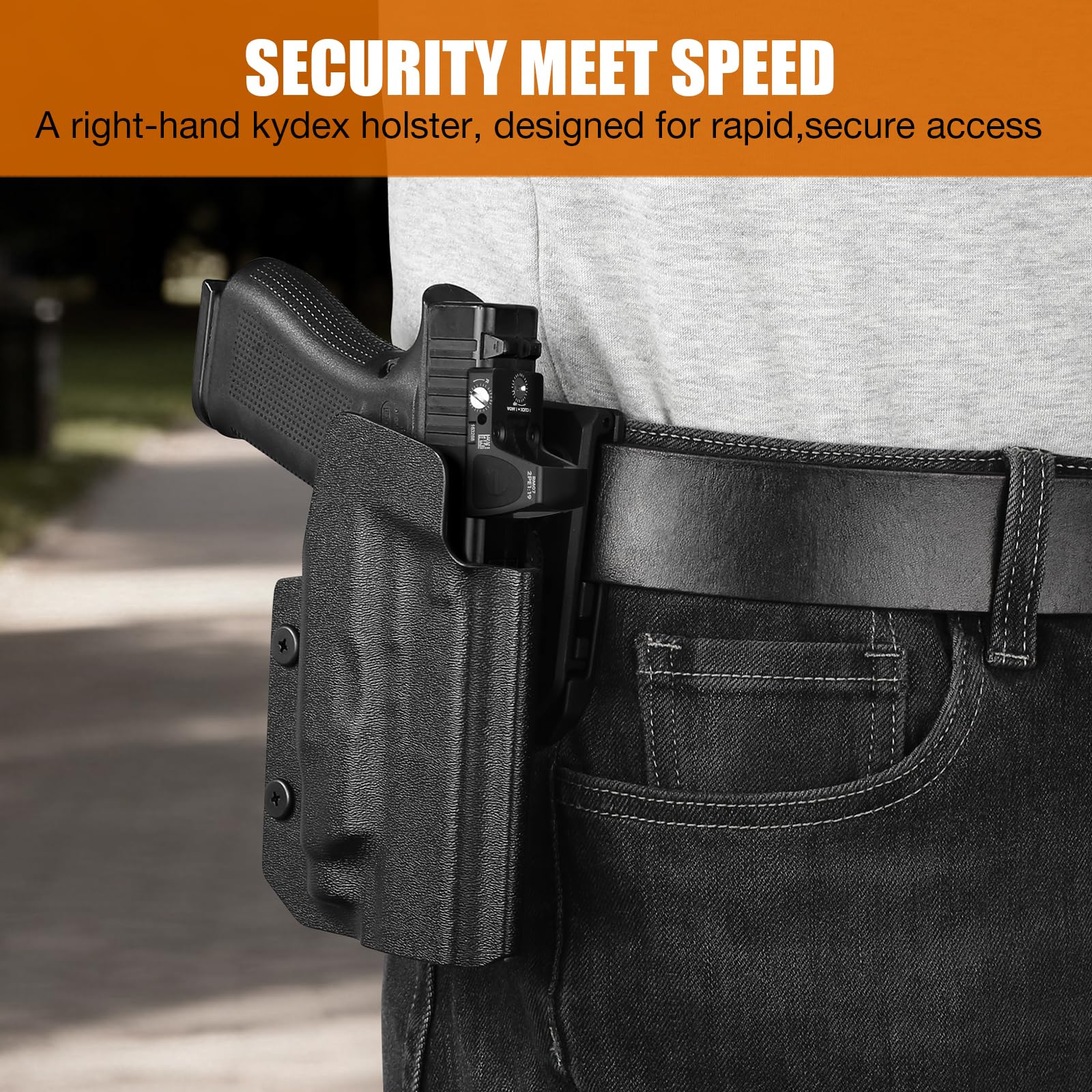 (Note: Not compatible with non-rail Glock 43 / 43X / 48, PSA Dagger Compact, or any listed pistols without the light installed.) - 𝘋𝘶𝘳𝘢𝘣𝘭𝘦 𝘜𝘚-𝘔𝘢𝘯𝘶𝘧𝘢𝘤𝘵𝘶𝘳𝘦𝘥 𝘒𝘺𝘥𝘦𝘹 – Built from tough 0.08-inch Kydex, offering a lightweight yet rugged construction designed for long-term everyday carry.