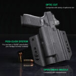 - COMPENSATOR & OPEN MUZZLE CUT – Glock 19 TLR1 holster can accommodate with various compensators – Over-Cut open muzzle accommodate with threaded barrel