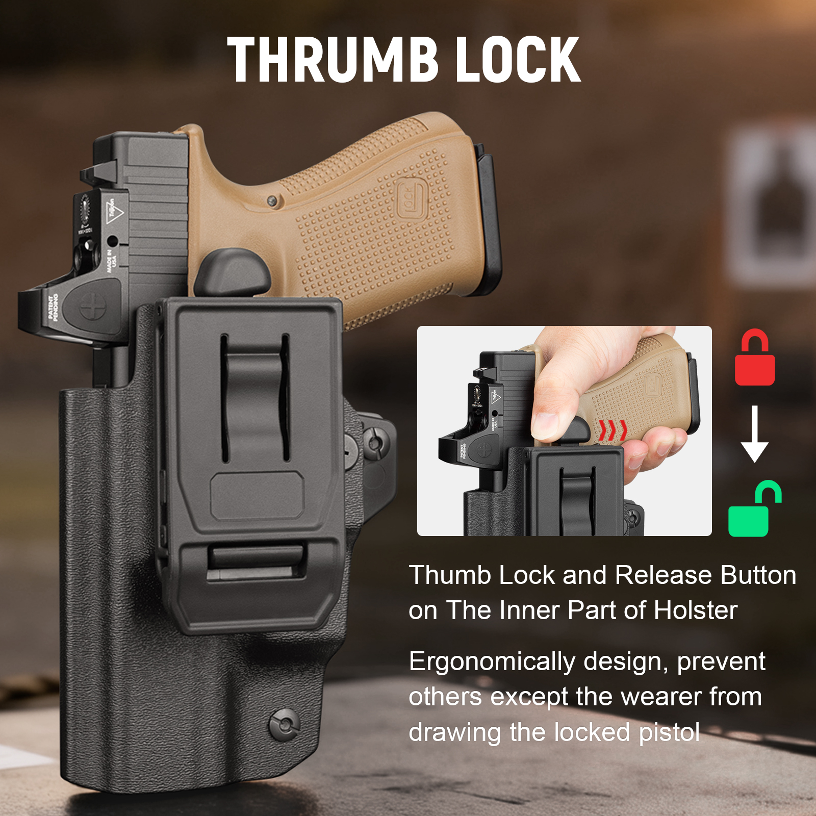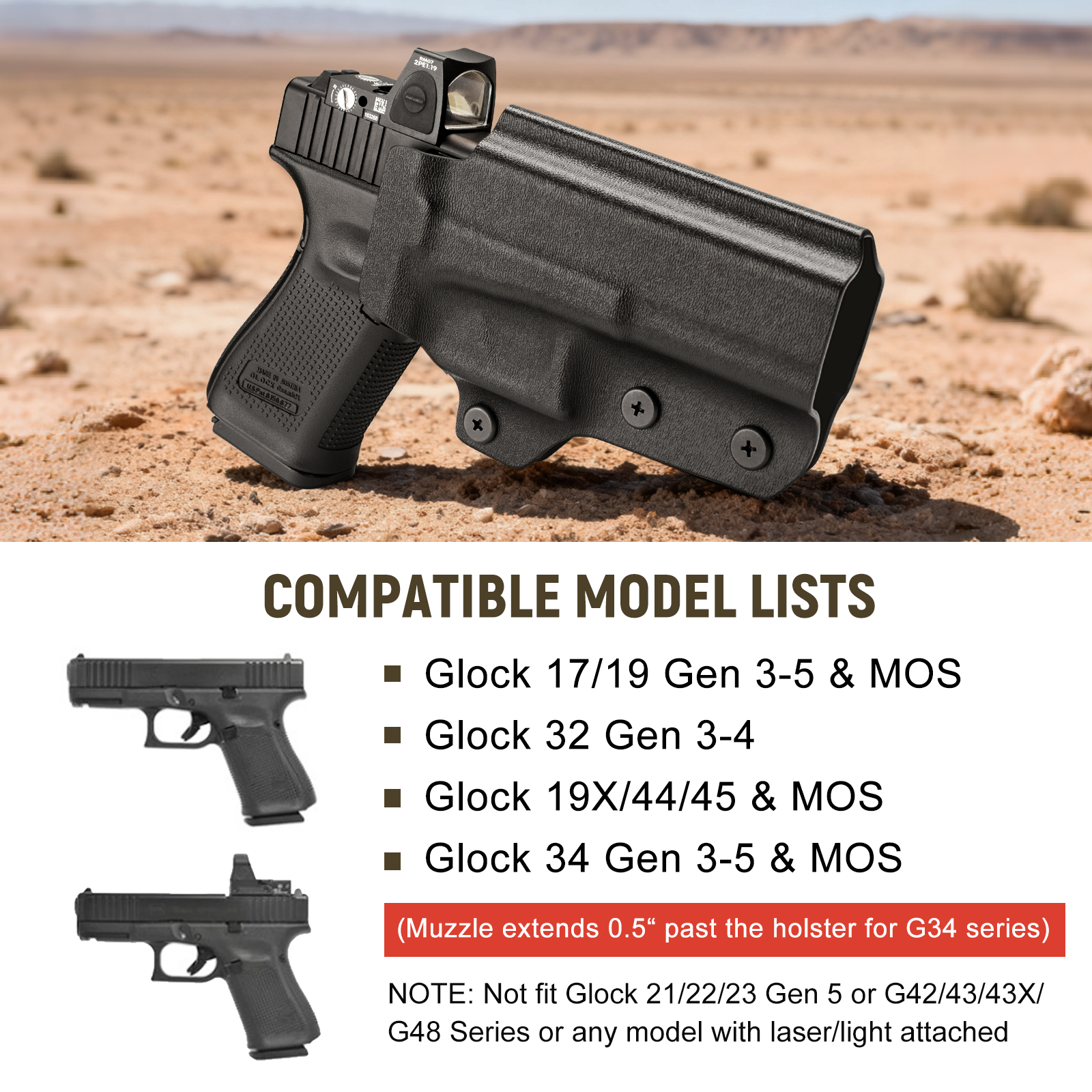 Wide Compatibility – Designed to fit Glock 17/19 Gen 3-5, Glock 23/32 Gen 3-4, Glock 19X/44/45, and MOS versions of the listed models. Not compatible with any laser or light attachments.
