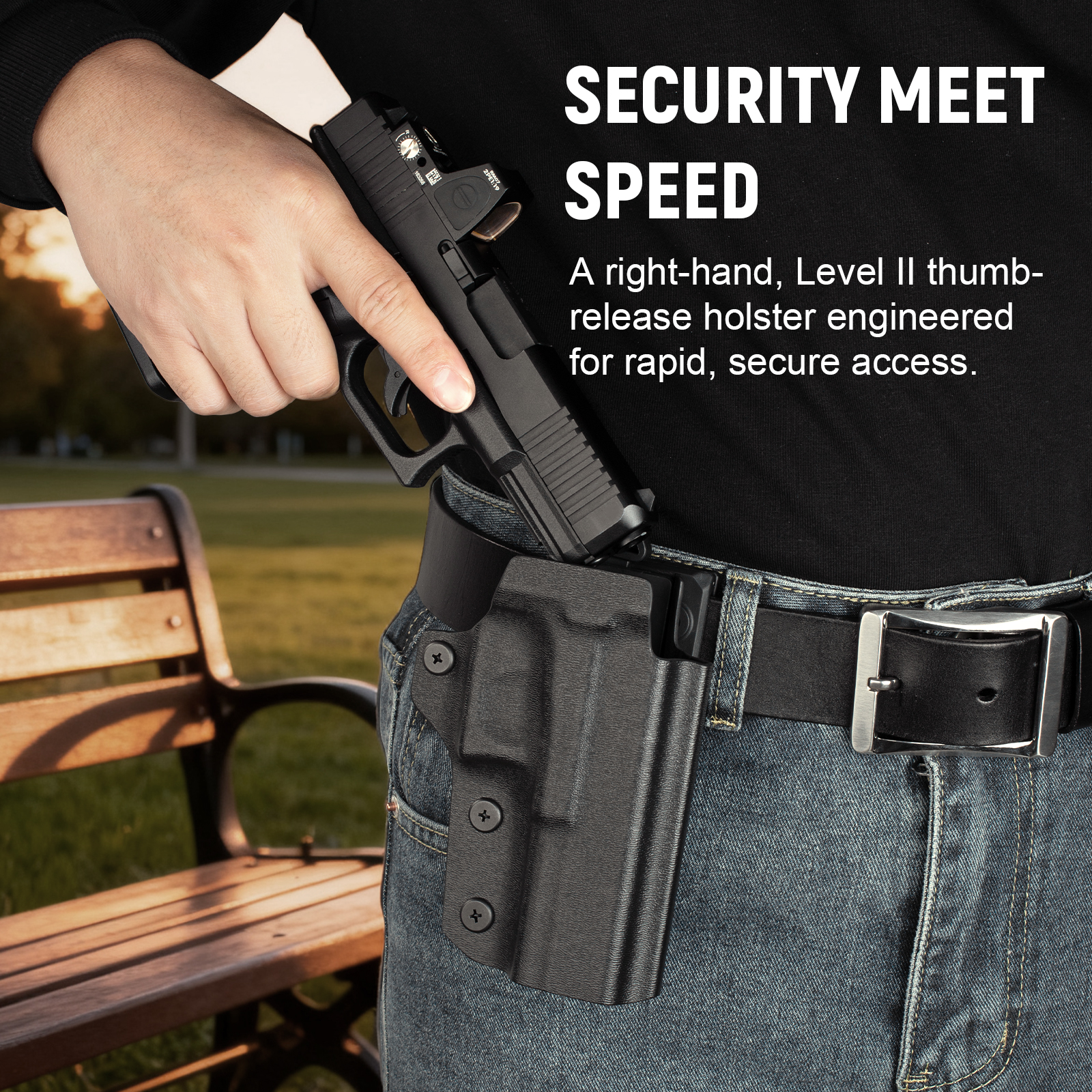 Thumb Release with Level II Retention – Quick-access thumb release ensures fast draw while Level II retention keeps the firearm secure and prevents unauthorized removal.