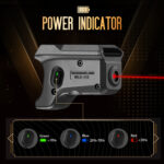 - Battery Indicator & Power Efficiency: It is the first laser to include power indicator to help you always get ready for tactical events and protection. 2 x CR1/3N batteries run for 4 hours. The indicator shows Green when the battery level is at 70%-100%, Blue at 20%-70%, Red at 0-20%