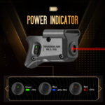 - Battery Indicator & Power Efficiency: It is the first laser to include power indicator to help you always get ready for tactical events and protection. 2 x CR1/3N batteries run for 4 hours. The indicator shows Green when the battery level is at 70%-100%, Blue at 20%-70%, Red at 0-20%