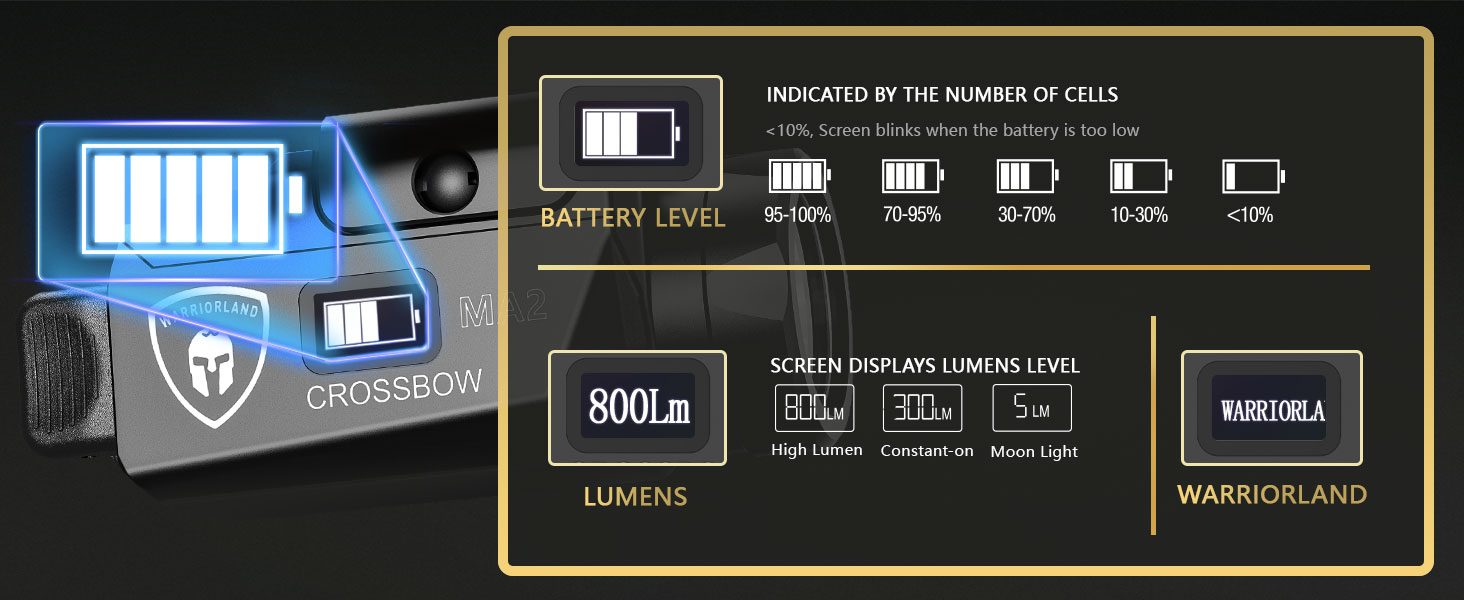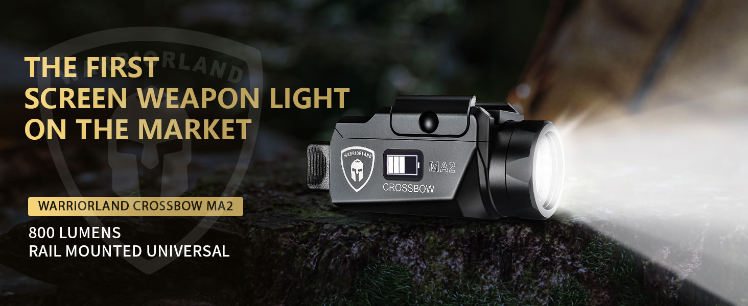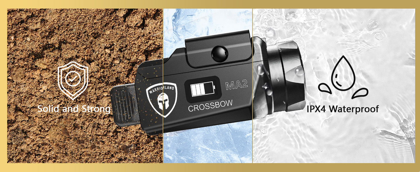 - WARRIORLAND CROSSBOW MA1: Universal pistol light with battery status and light mode display for enhanced preparedness in low-light conditions. High Brightness & Green Laser Combo: Illuminate up to 137 meters with 800 lumens.