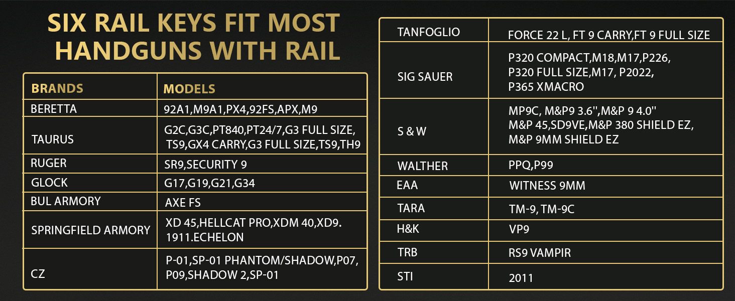 - Universal Compatibility: Compatible with most rail-equipped handguns and supplied with 6 different keys for easy attachment to various pistols. Ideal for use as a universal rail mount pistol light.